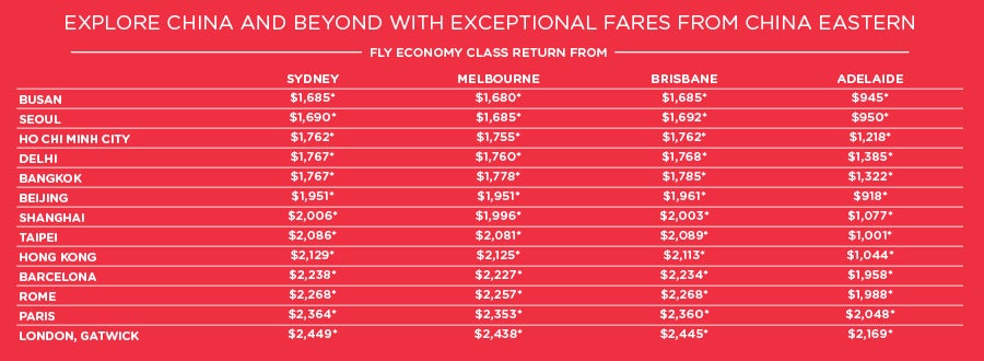 *Conditions apply. Offer valid until 30 April 2026. Prices are per person in Australian dollars and are correct as at 26MAR26 but may fluctuate if surcharges, fees, taxes or currency change. MEL, SYD, BNE: Valid for travel from 06 April 26 to 31 October 26. ADL, SYD, BNE: Valid for travel from 06 April 26 to 31 October 26. ADL: Valid for travel from 21 Jun 26 until 02 August 26 Offers subject to availability. Agents may charge service fees, rates vary. Prices displayed are ‘from’ pricing, includes all prepaid taxes and fees, except payment card fees which may be payable in addition, rates vary. Prices displayed are based on the departures dates as displayed. Alternate travel dates are subject to a seasonal surcharge. Day of week surcharges, flight restrictions and blackout dates may apply. Please check all prices, availability and other China Eastern terms and conditions and Helloworld Travel online Booking Terms and Conditions apply.